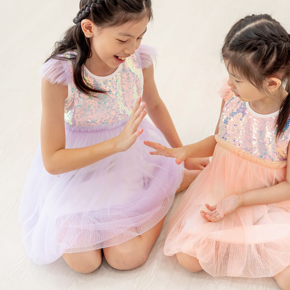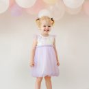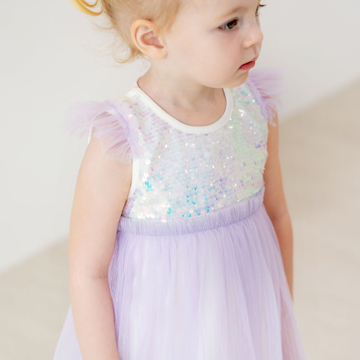 Crafted with layers of the softest lilac tulle and finished with iridescent sequins, this dress catches the light beautifully, creating a magical sparkle with every movement. Beneath the tulle, a soft inner cotton jersey lining (95% cotton, 5% spandex) ensures breathability and gentle comfort, allowing your little one to enjoy long celebrations without fuss.