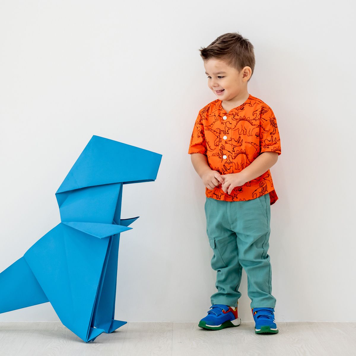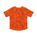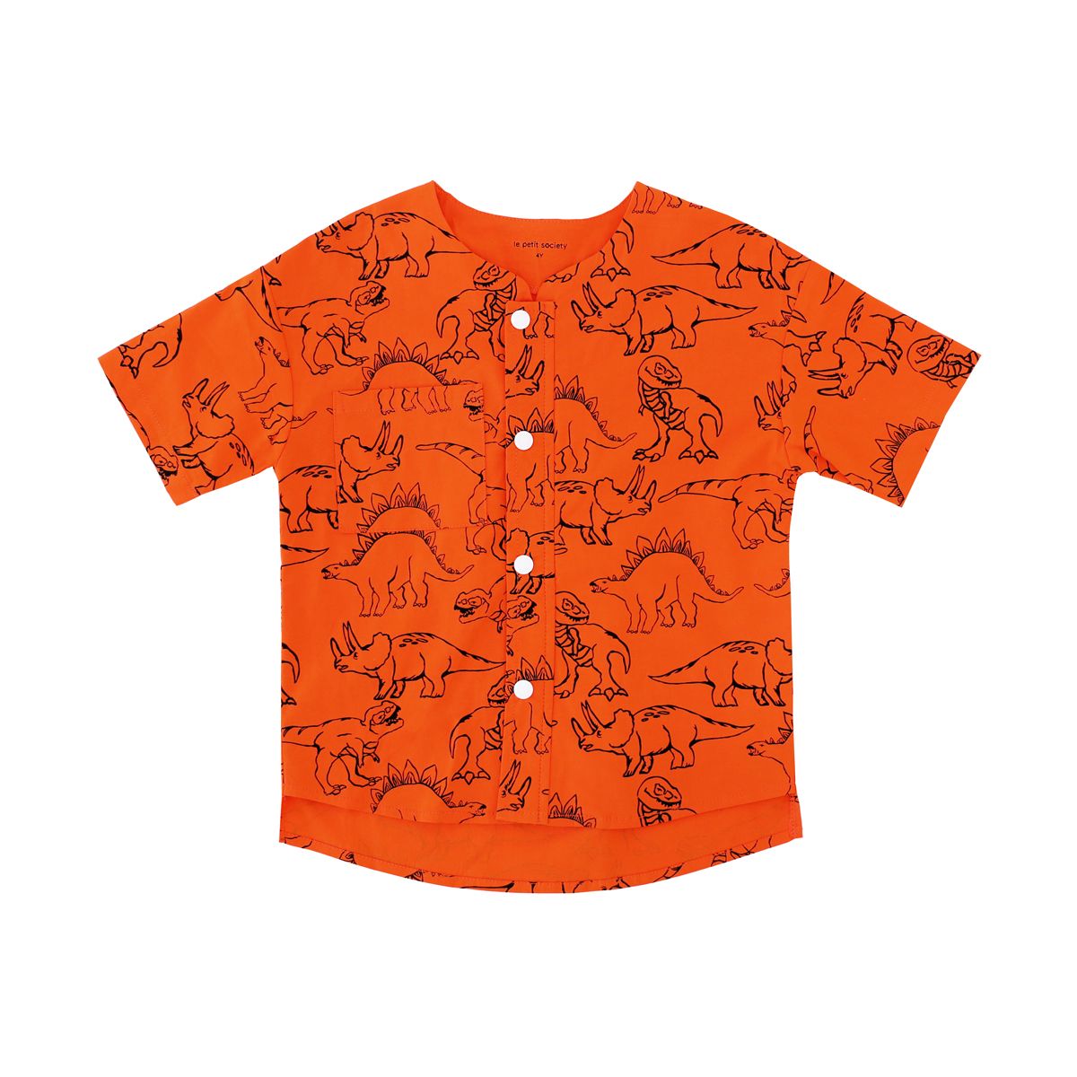 Designed with both style and practicality in mind, the shirt features a wide front pocket to store small treasures, snacks, or keepsakes. Snap buttons along the front make dressing quick and fuss-free, while a curved collar adds extra comfort for all-day wear. The bold orange hue and lively dinosaur sketches make this shirt a fun, standout piece for playdates, outdoor explorations, or dinosaur-themed parties.