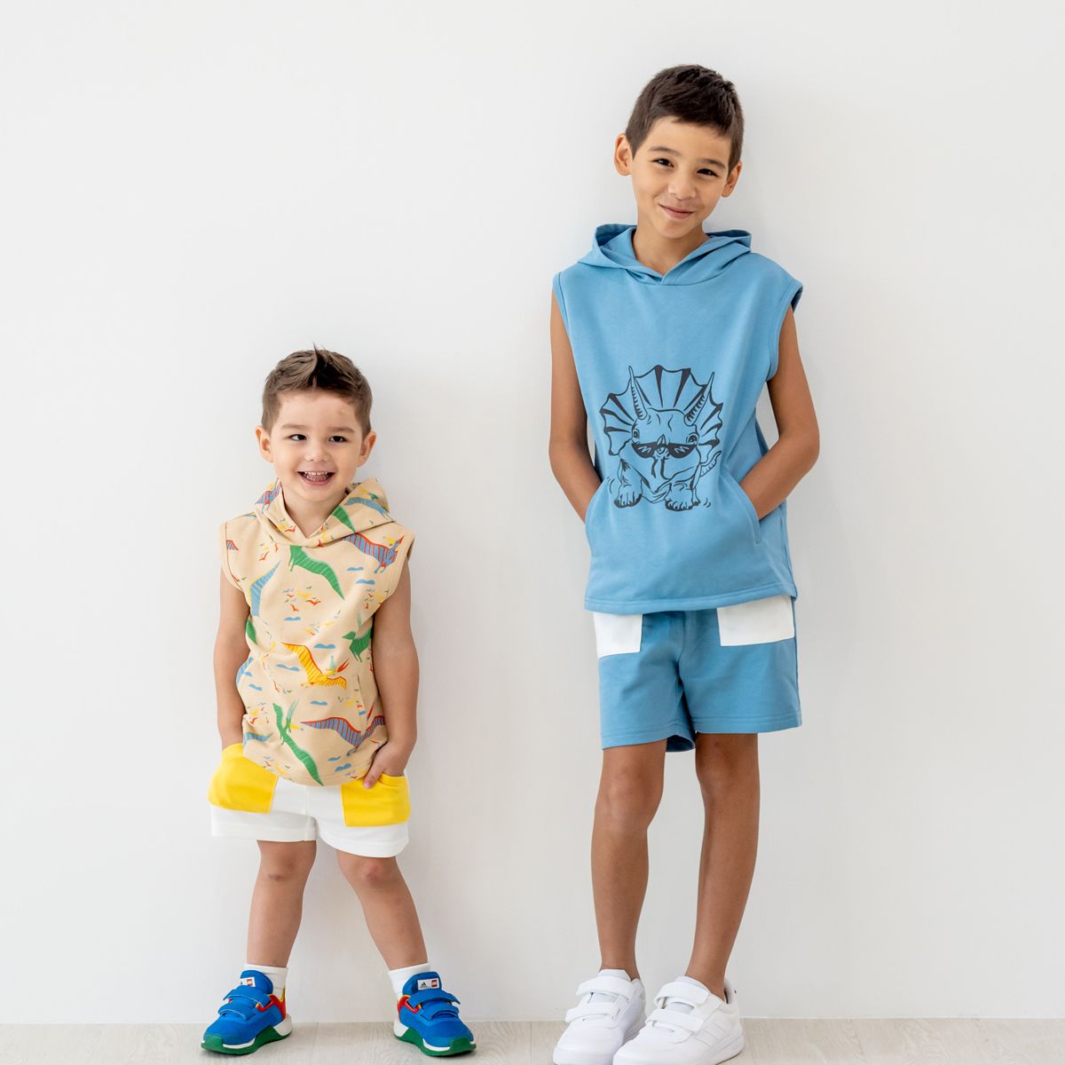 The all-over triceratops print adds a lively, playful touch that dinosaur lovers will adore. Crafted from a soft cotton-polyester blend (80% cotton, 20% polyester), the fabric is lightweight, breathable, and durable, keeping kids cool and comfortable while allowing freedom of movement for all their explorations.